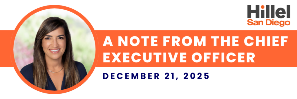 I want to share a quick update on the incident that happened at Hillel of San Diego last week. But, before that, I want to thank you for showing up for us during this time. I received so many messages of concern and support. It meant the world to me, our team, and our students to know that the community was standing in solidarity with us.