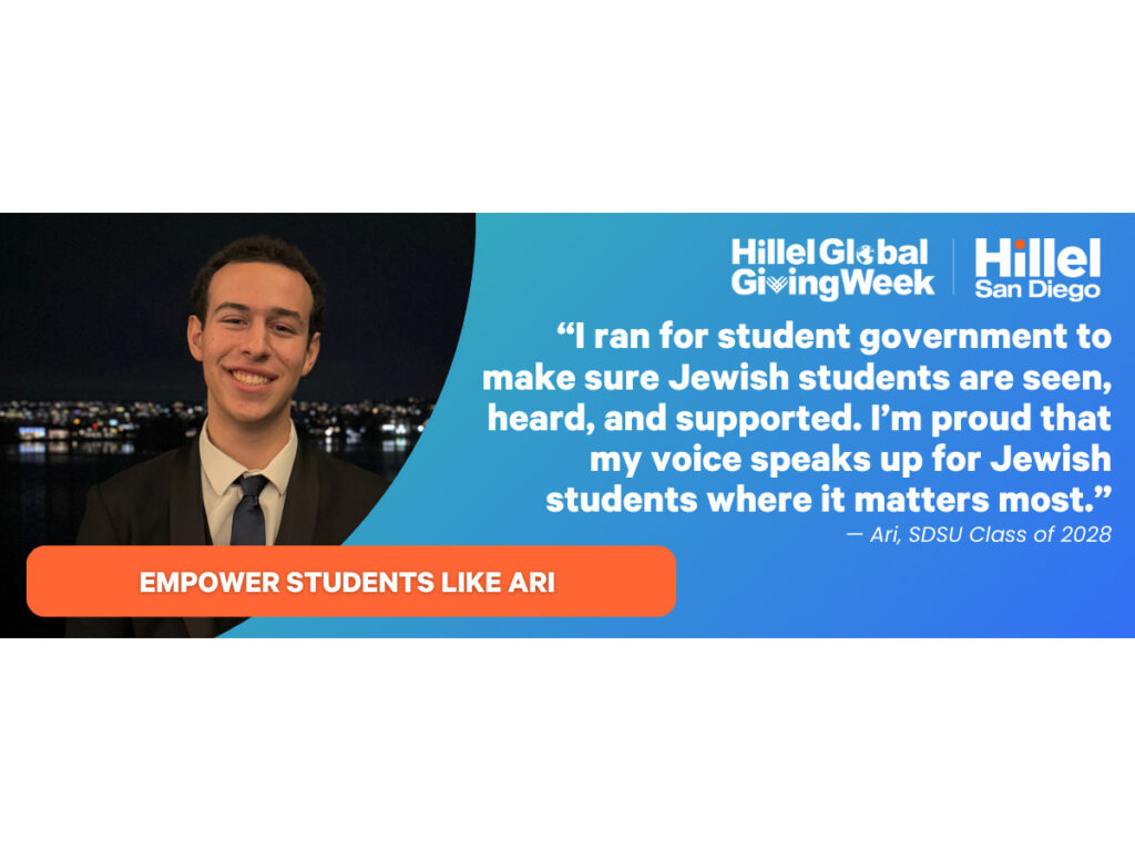 “I ran for student government to make sure Jewish students are seen, heard, and supported. I’m proud that my voice speaks up for Jewish students where it matters most.” – Ari, SDSU Class of 2028
